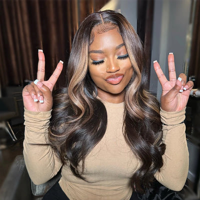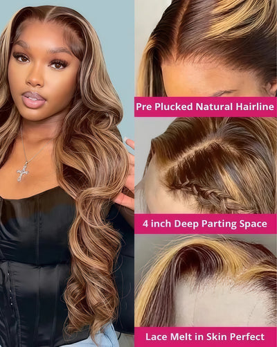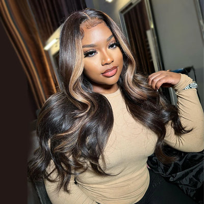 “Golden Truffle" Glueless Brazilian Human Hair Transparent Lace – P4/27 Honey Highlighted Body Wave wig