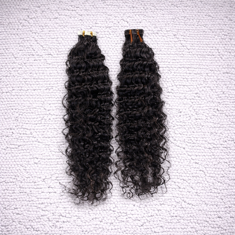 Deep Curl Tape-In Brazilian Human Hair Extensions – 100% Natural Black | Invisible Adhesive | Reusable