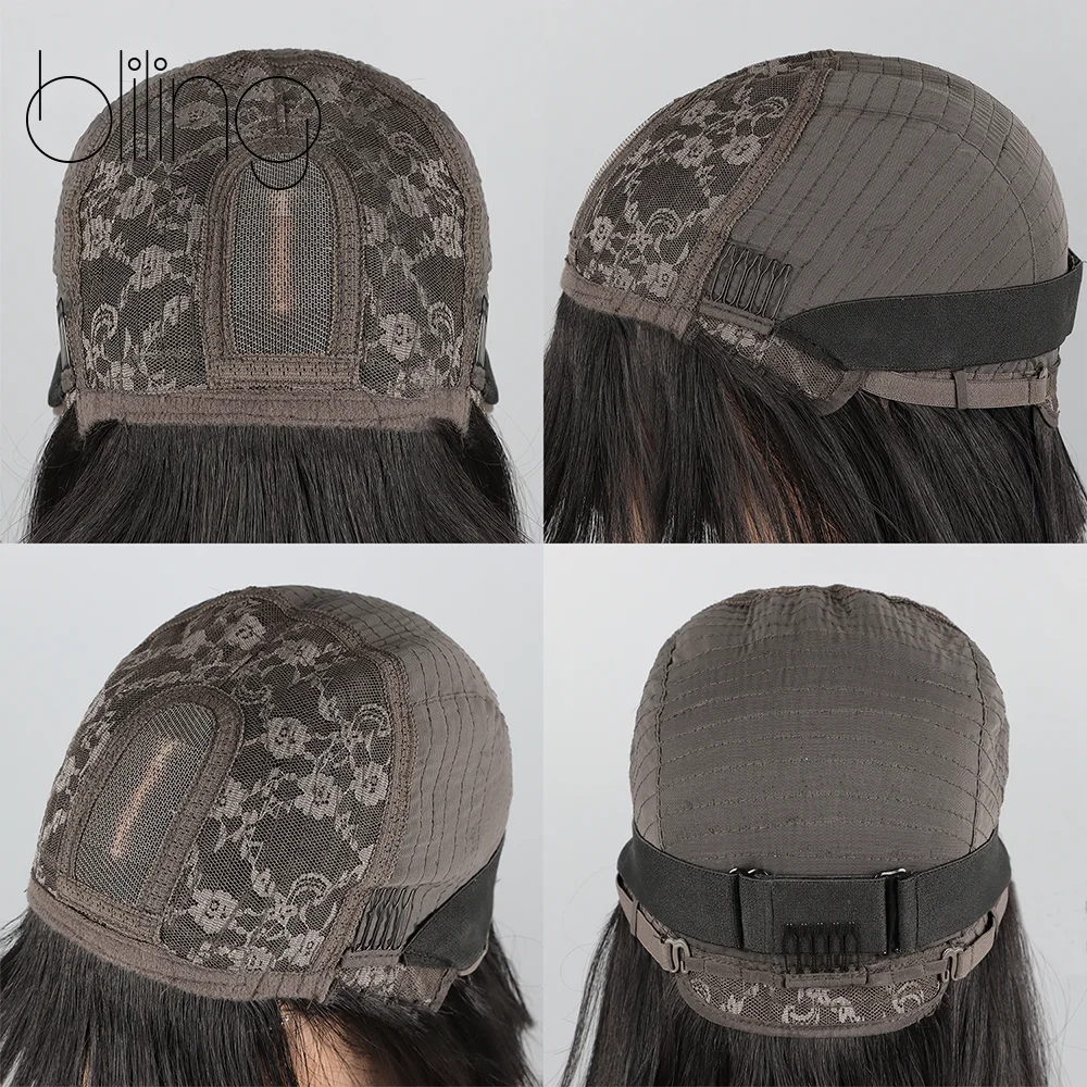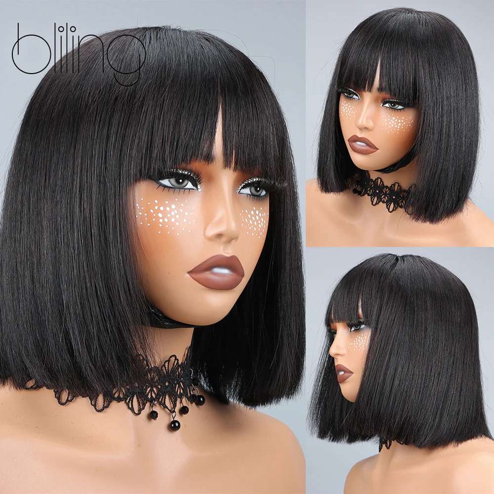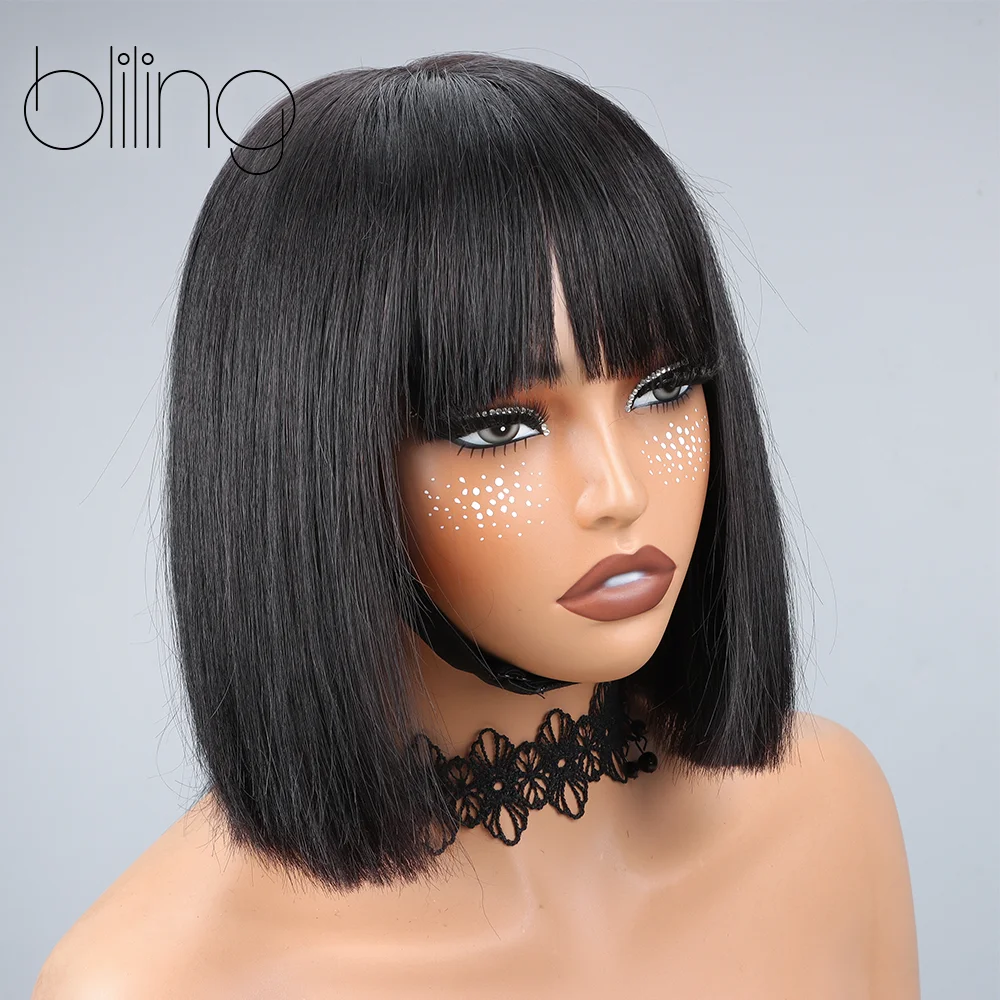 200% Human Hair Wig With Bang Natural Glueless Straight Layered Bob Hairstyle 1X13 Transparent Lace Black for Women 10 Inch