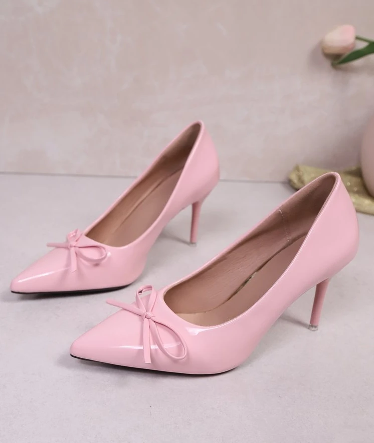 Fashion pointed-toe design elegant bow tie stiletto heels, 2025 summer sexy patent leather high heels, large size women's shoes