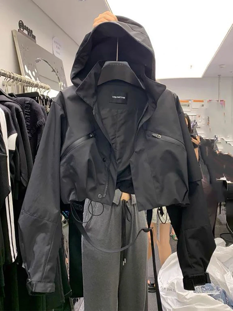 Fashion Short Hooded Jacket Black Loose Coats Female Street Windbreak Short