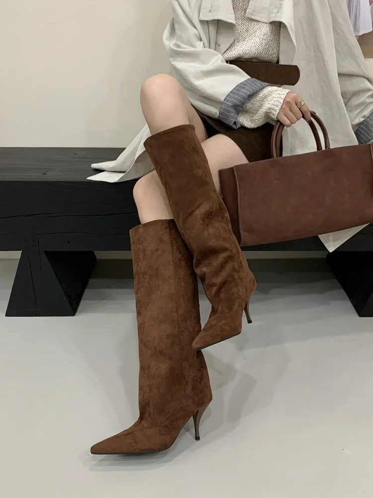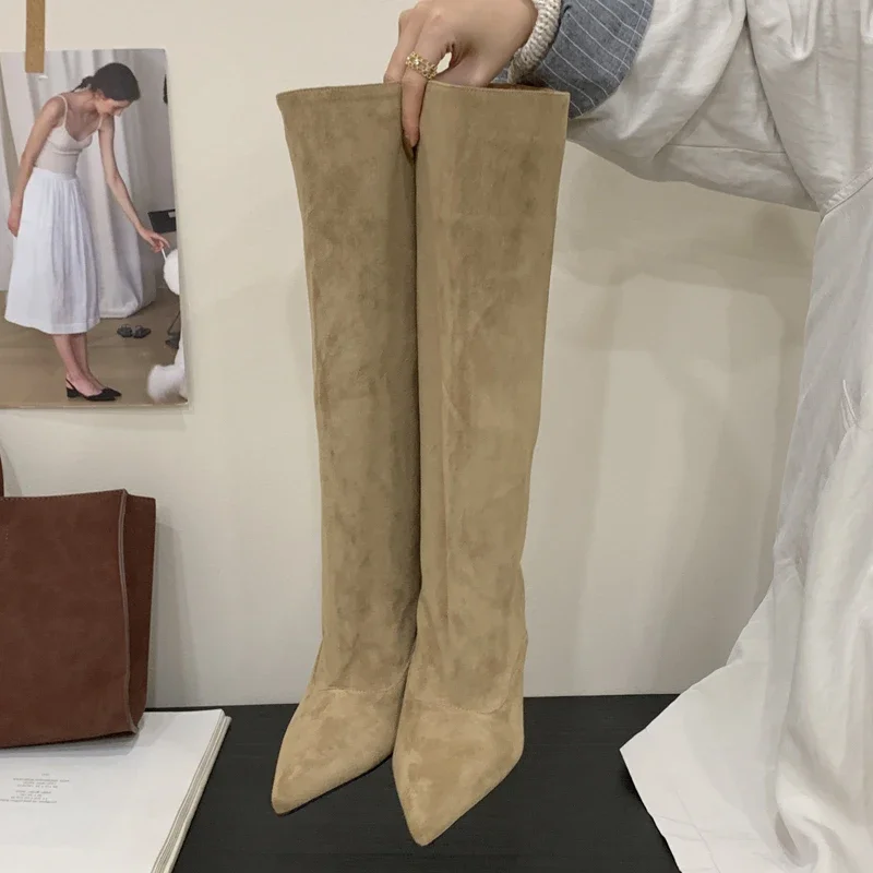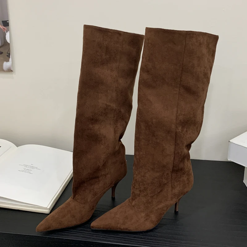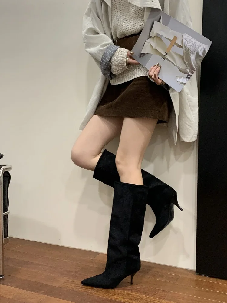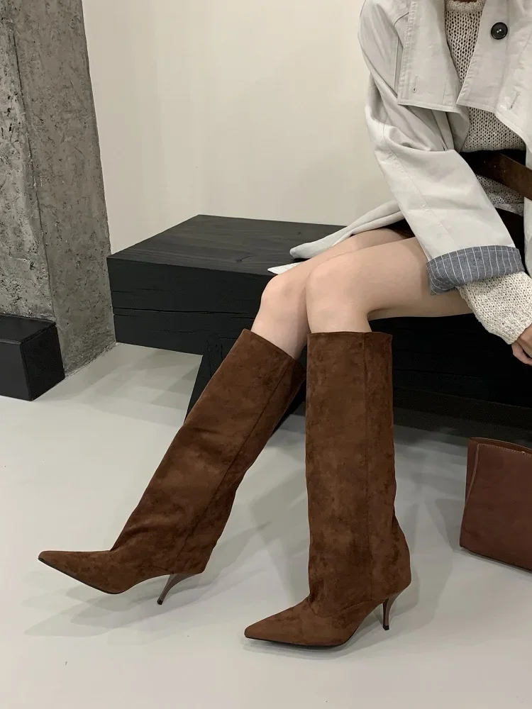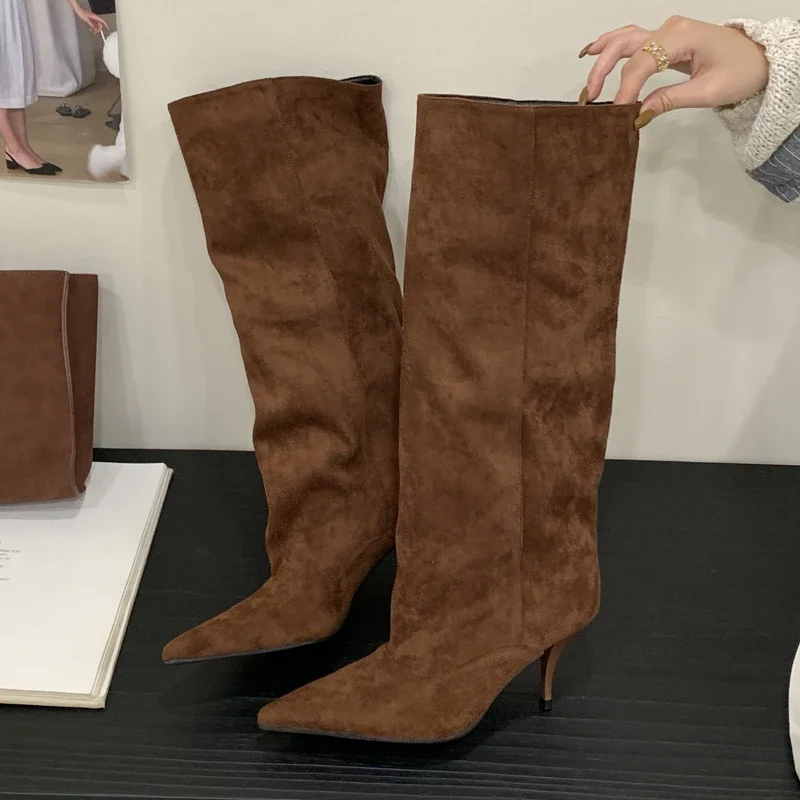 Fashion Vintage Thin Heels Women Knee High Boots Fashion Winter Sexy Pointed Toe Stripper Party Shoes Zapatos De Mujes
