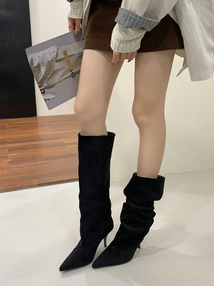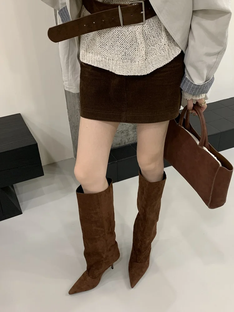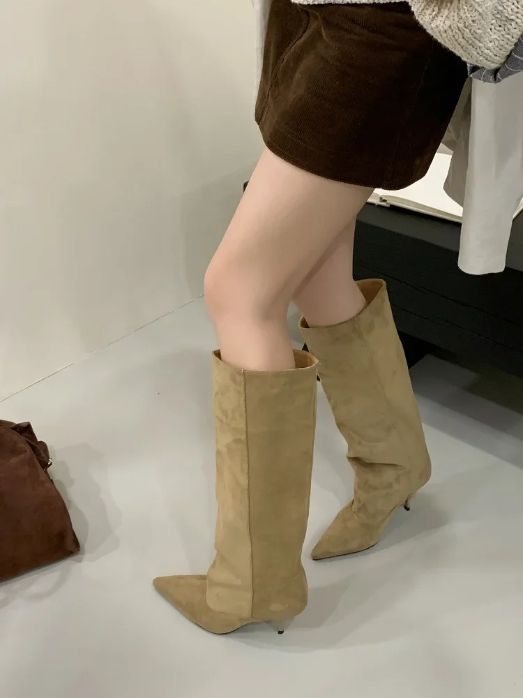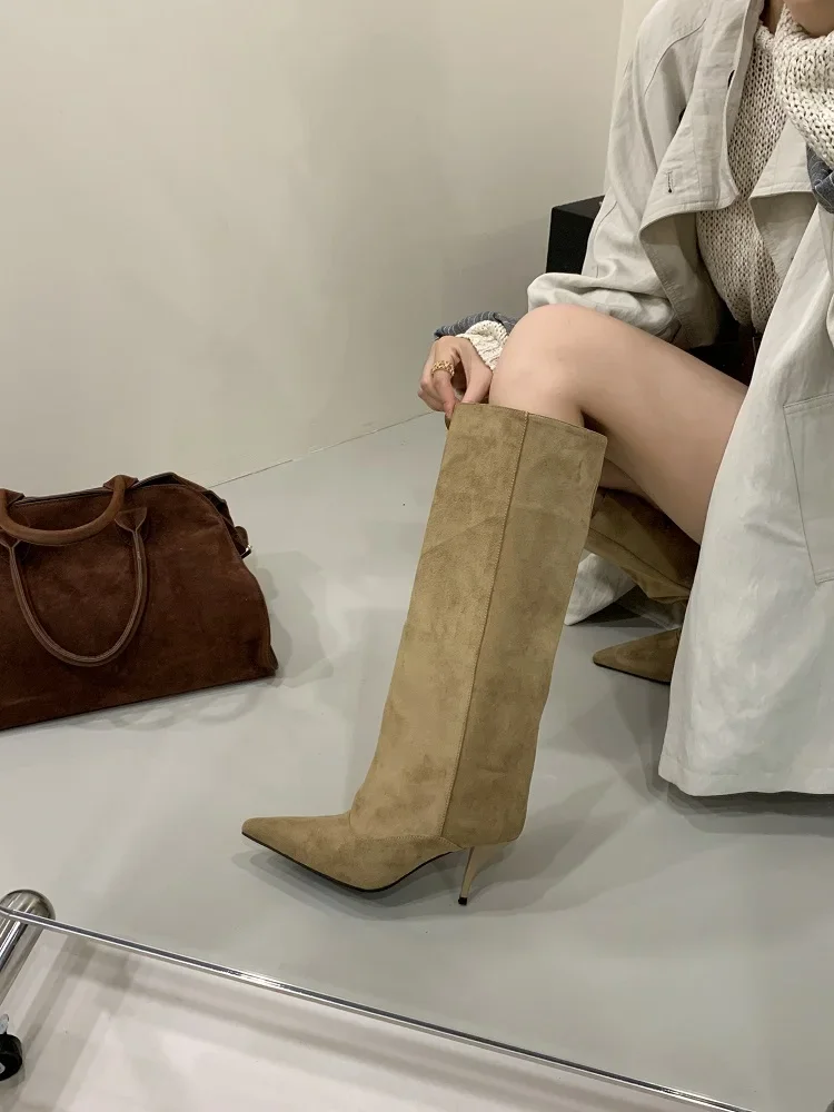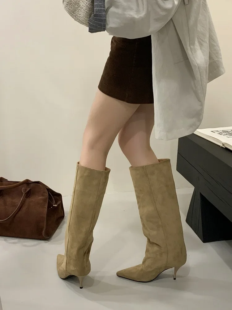 Fashion Vintage Thin Heels Women Knee High Boots Fashion Winter Sexy Pointed Toe Stripper Party Shoes Zapatos De Mujes