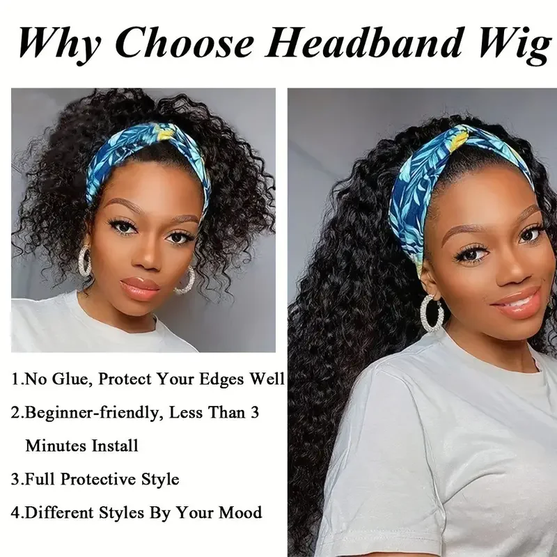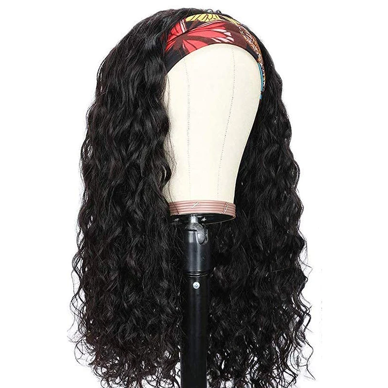 Headband Wigs-Water Wave Headband Wigs Human Hair For Women, 16-24 Inches Remy Hair Full Machine Made Black Curly Hair Band Wigs